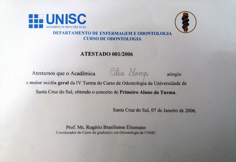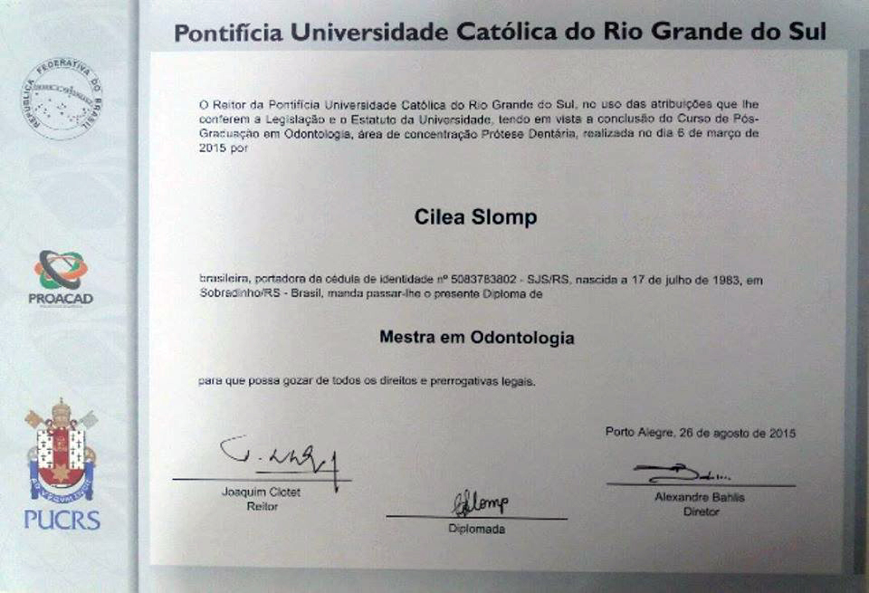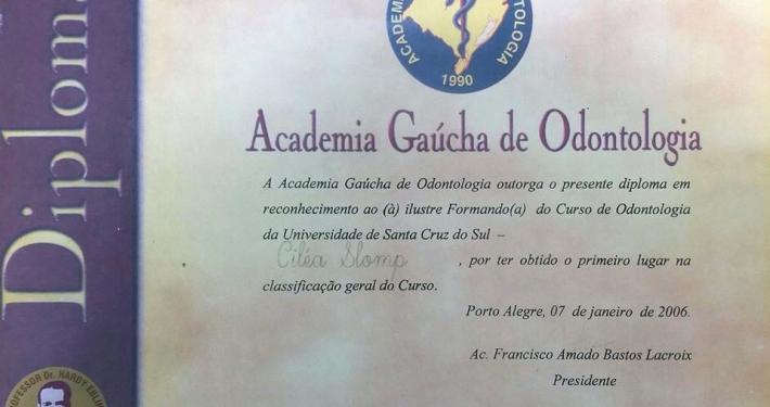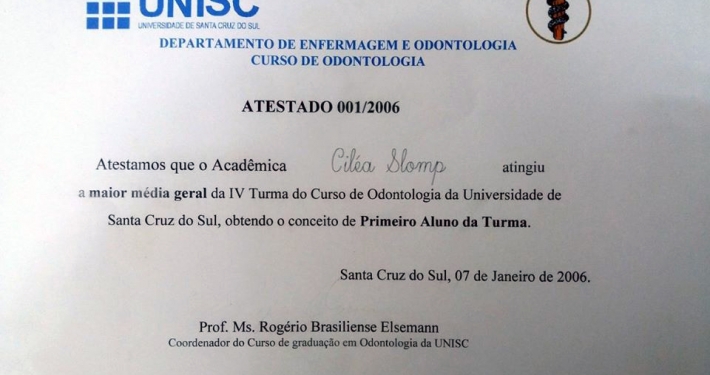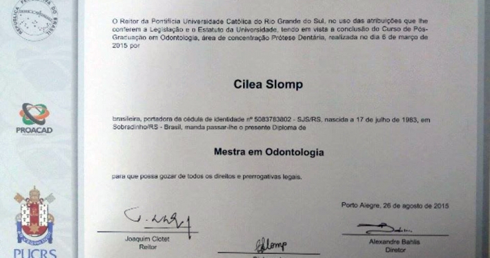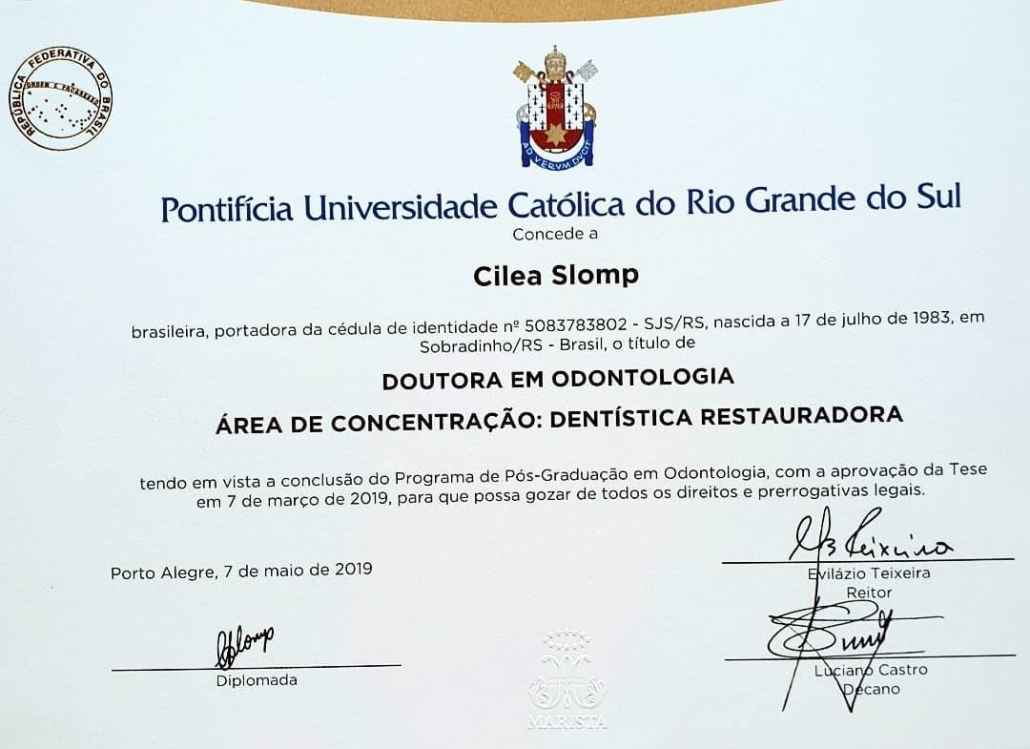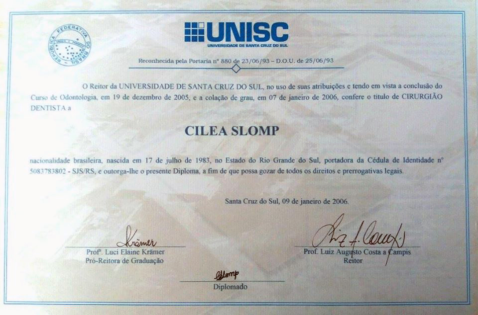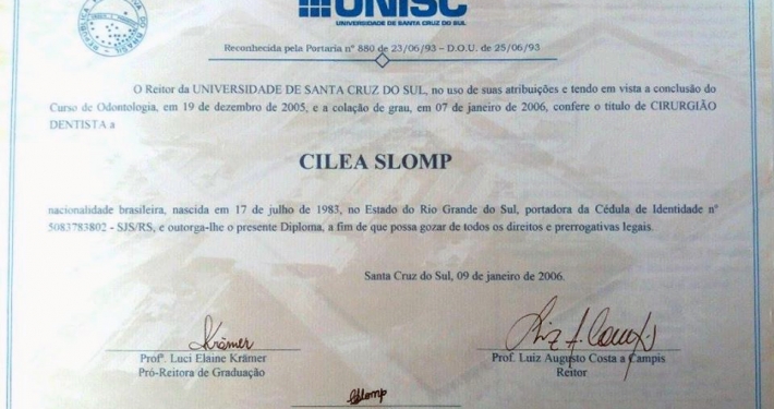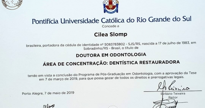 “Hoje a minha gratidão vai para a Dra. Cilea Slomp, a minha dentista, a profissional responsável pela liberdade que tenho hoje de sorrir, por me ajudar a realizar meu grade sonho que era sorrir sem medo. Para quem não sabe, eu tinha sérios problemas no meus dentes e ela me falou sobre um tratamento que tinha de lentes de contato de porcelana que poderia sim resolver o problema dos meus dentes. Então, estou super satisfeita, eu super recomendo o trabalho dela, ela tem brilho nos olhos pelo que faz, ela tem amor e ela realizou um trabalho de excelência.”